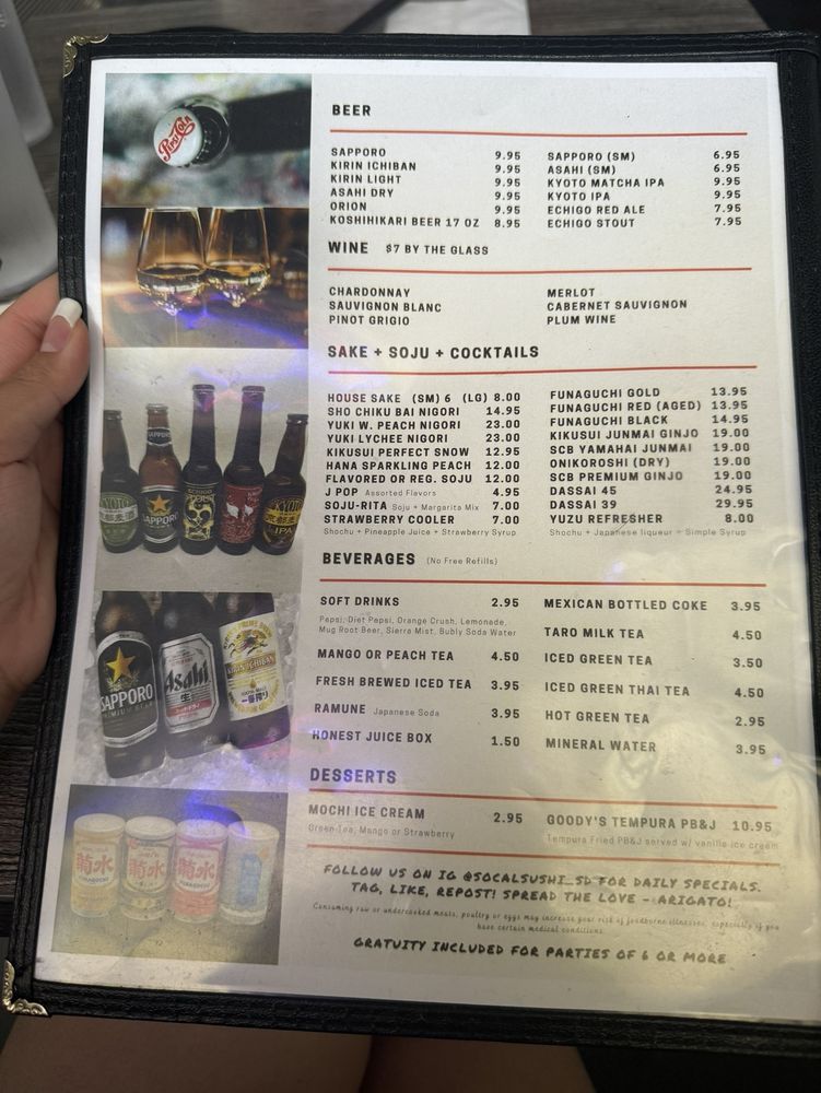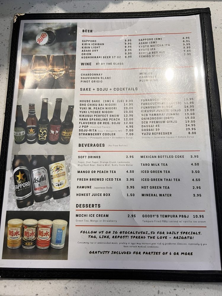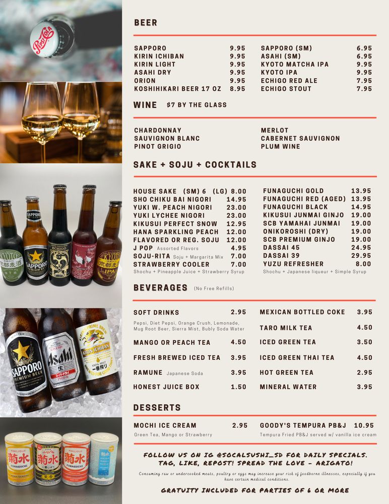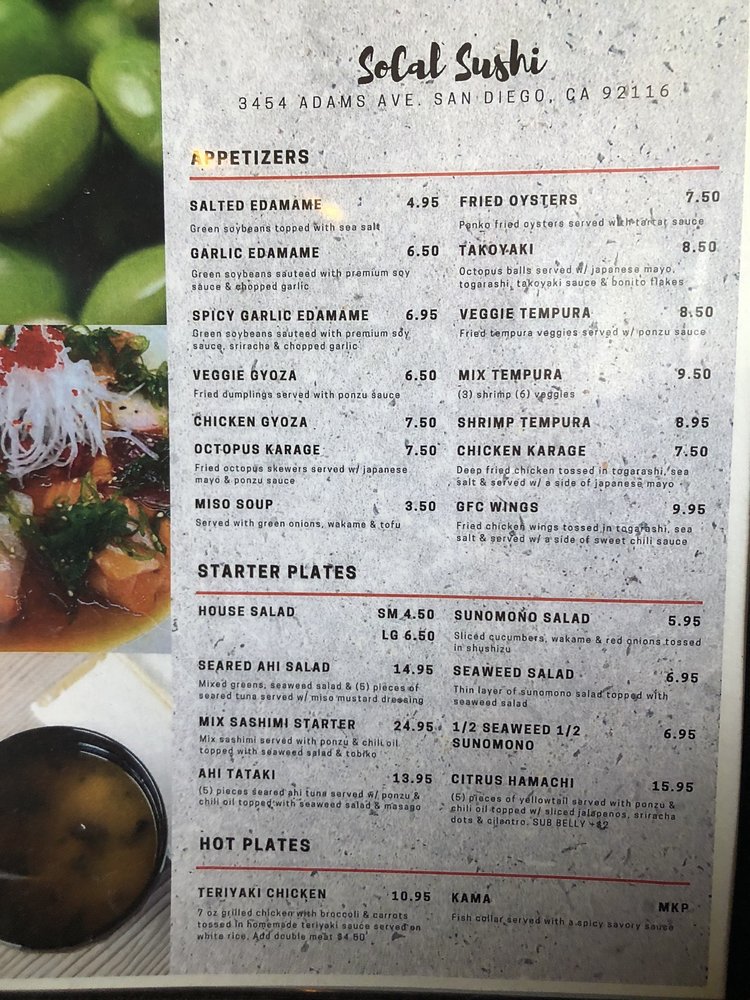 Introducing the menu at SoCal Sushi, a quaint sushi bar located in San Diego, CA. This Asian-owned and women-owned establishment offers a variety of vegan and vegetarian options, as well as wheelchair accessibility and gender-neutral restrooms. The menu features fresh and delicious offerings like shrimp tempura rolls, omakase specials, and unique rolls like the Avatar Roll and Black Dragon Roll. Customers rave about the exceptional service, fresh fish, and curated selection of beers, wines, soju, and sake. With options for takeout, delivery, and catering, SoCal Sushi is perfect for a casual dinner or special occasion. Don't miss out on the opportunity to experience the welcoming atmosphere and tasty creations at SoCal Sushi.