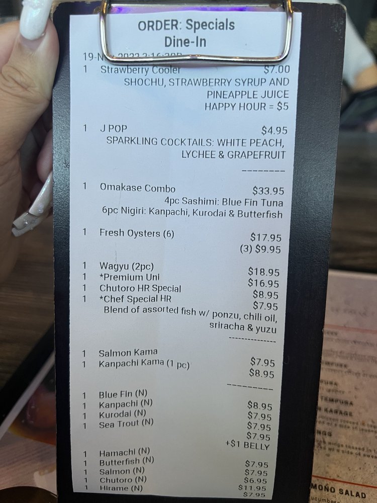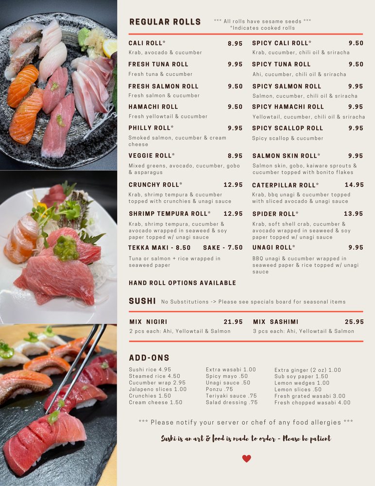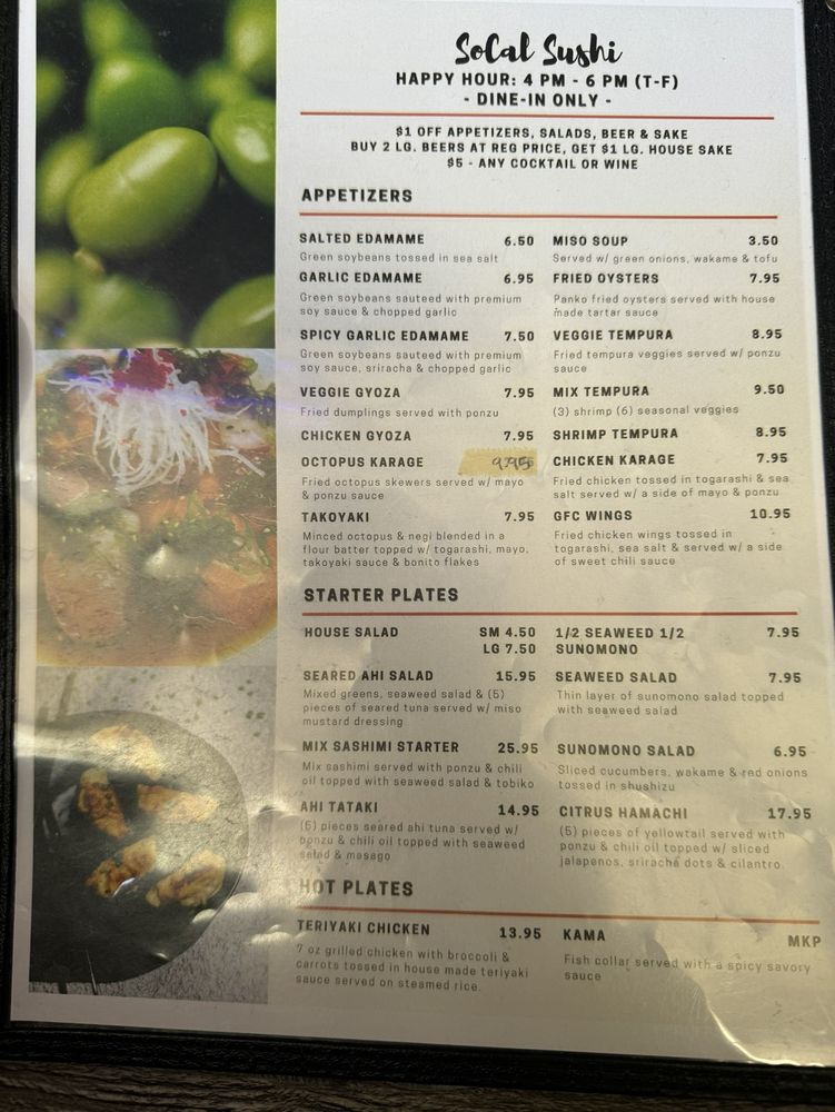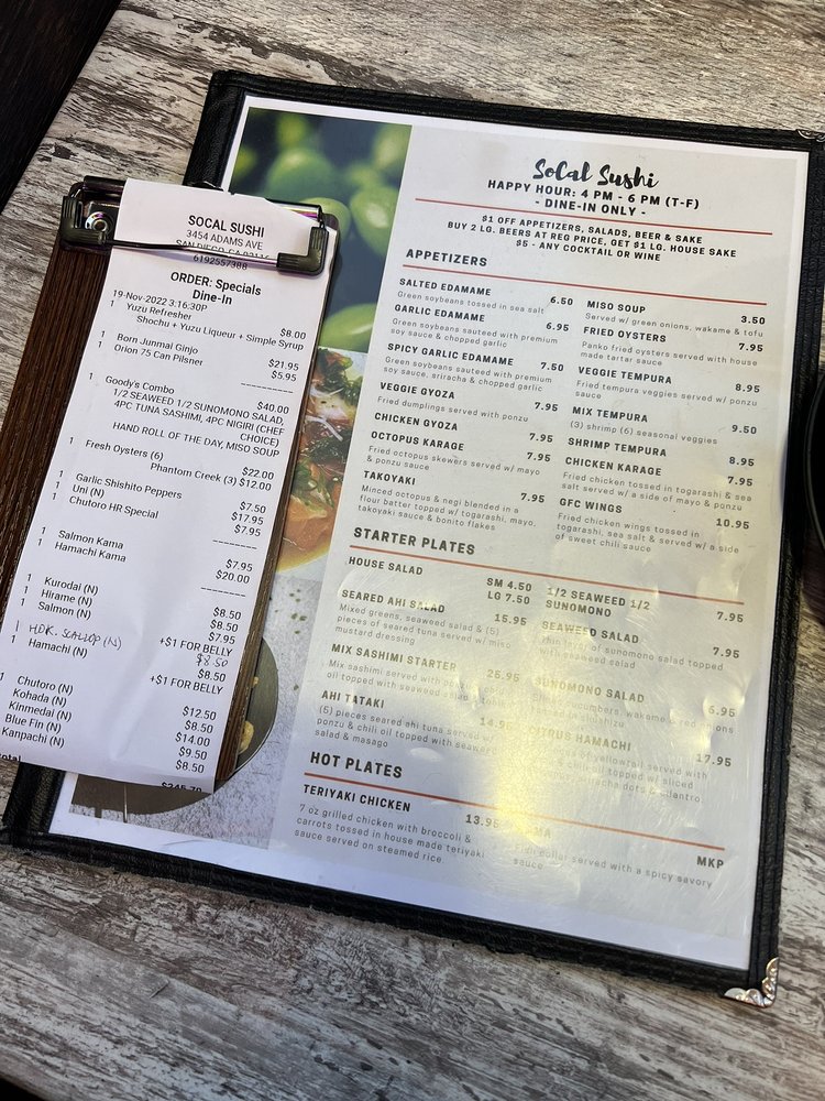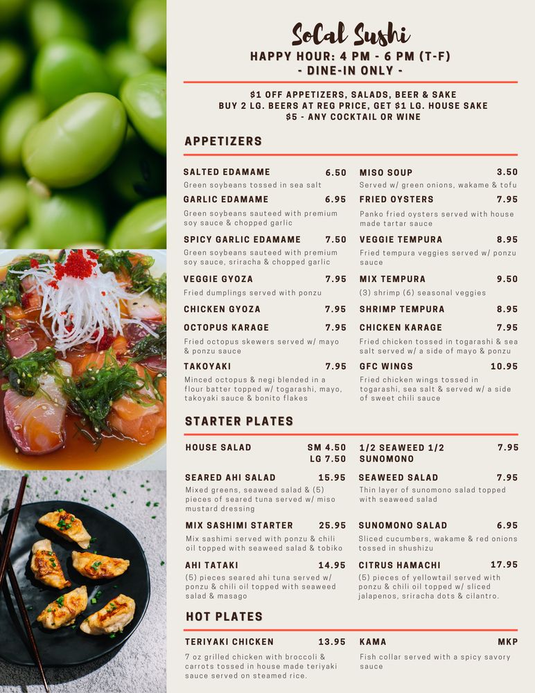 Introducing the menu at SoCal Sushi, a quaint sushi bar located in San Diego, CA. This Asian-owned and women-owned establishment offers a variety of vegan and vegetarian options, as well as wheelchair accessibility and gender-neutral restrooms. The menu features fresh and delicious offerings like shrimp tempura rolls, omakase specials, and unique rolls like the Avatar Roll and Black Dragon Roll. Customers rave about the exceptional service, fresh fish, and curated selection of beers, wines, soju, and sake. With options for takeout, delivery, and catering, SoCal Sushi is perfect for a casual dinner or special occasion. Don't miss out on the opportunity to experience the welcoming atmosphere and tasty creations at SoCal Sushi.
